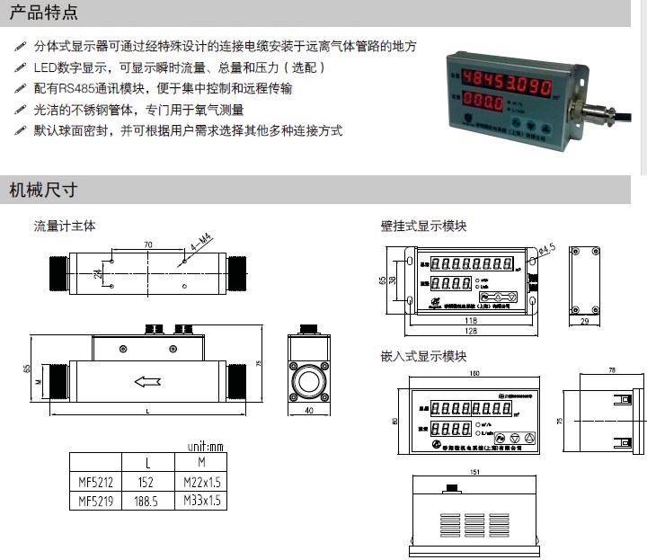MF5200帶壓力(lì)顯示型(xíng)數顯氧(yang)氣流量(liang)計 特點: